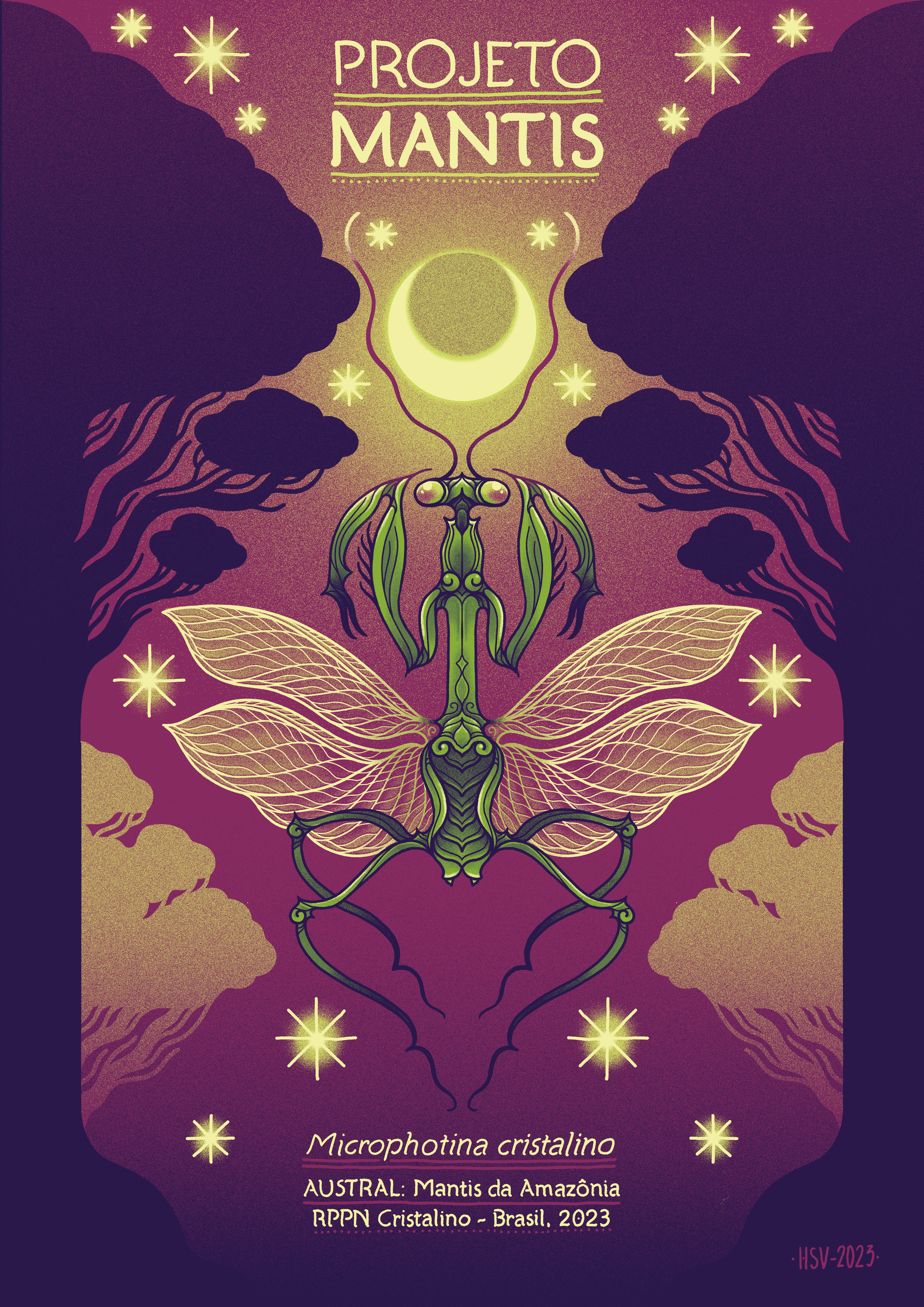Poster criado para o Projeto Mantis, que pesquisa novas espécies de louva-a-deus no território brasileiro. Esse poster especificamente foi lançado para divulgar a descoberta do Microphotina Cristalino, uma pequena amazônica. O intuito do projeto é reforçar a importância da preservação dos biomas que ainda guardam biodiversidade incalculável nos menores cantos.